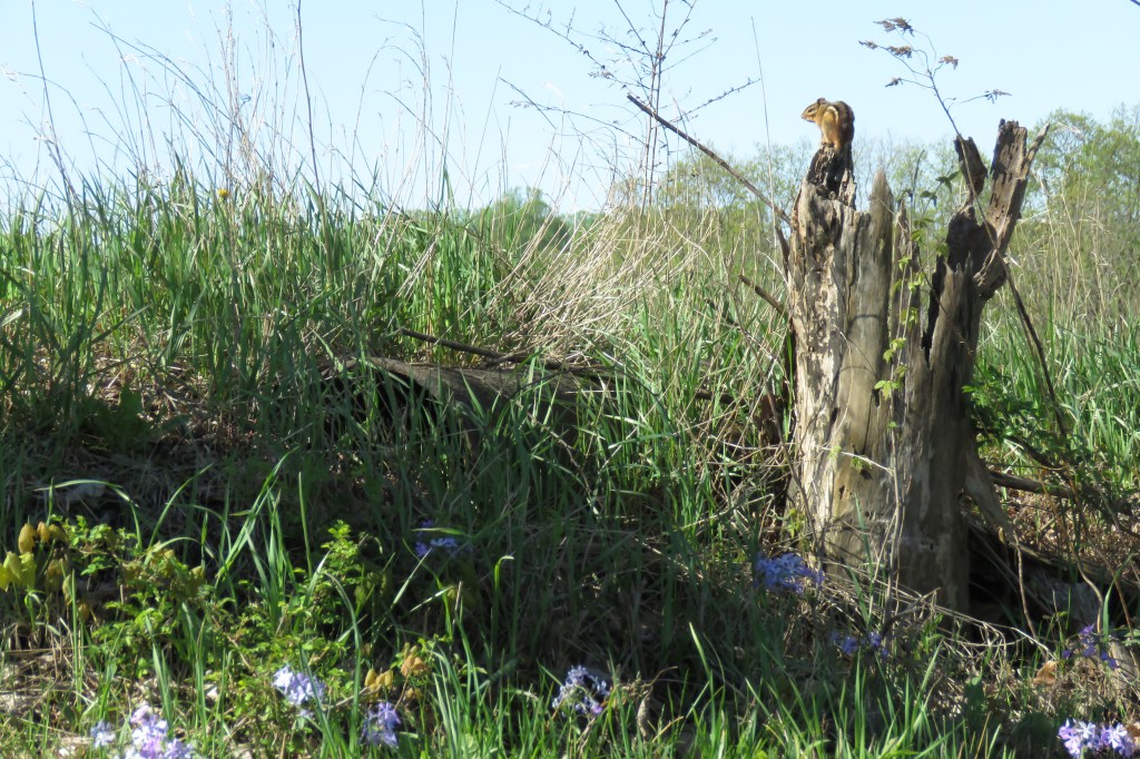 My wife and I decided to go for a country drive. We drove slowly, taking in the beauty of nature. Suddenly, I saw this chipmunk on a stump. I took the opportunity to take a picture of it. It is no award winning photo, but it speaks boldly of Spring. The chipmunks are plentiful but it is not every day that I get the opportunity to see one that is so boldly sitting on a rotten stump looking at Spring. And, the flowers were beautiful.