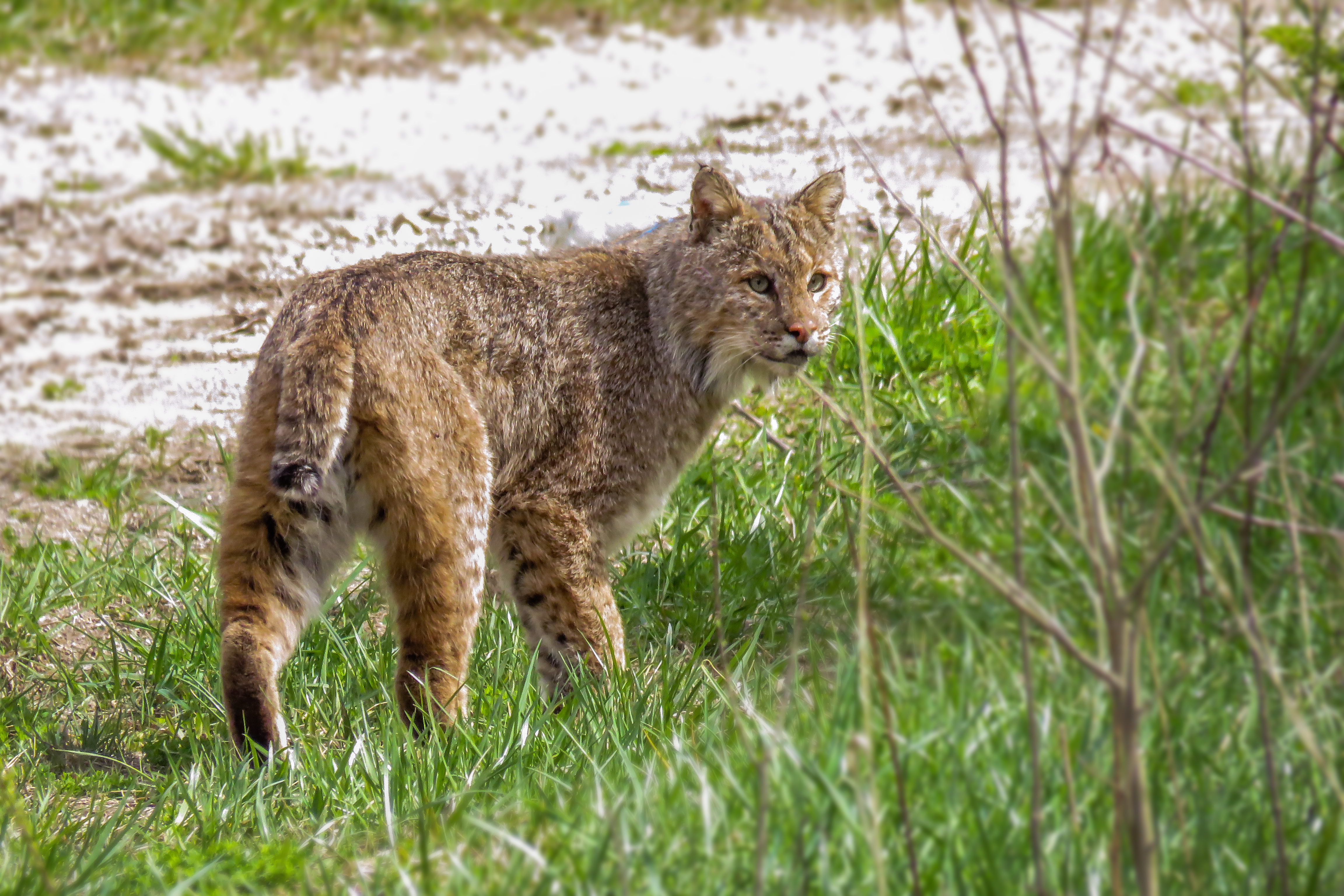Almost before I knew it this bobcat was right in front of us. We looked at each other for a moment. It was not in a hurry to get away, but slowly walked along, sniffing at the grass and bushes. I started taking pictures as fast as I could. It gave us one backward glance, as if asking, “Are you done now?’ then leaped into the bushes and disappeared. I had an opportunity to take a picture of a rare moment and I took it.