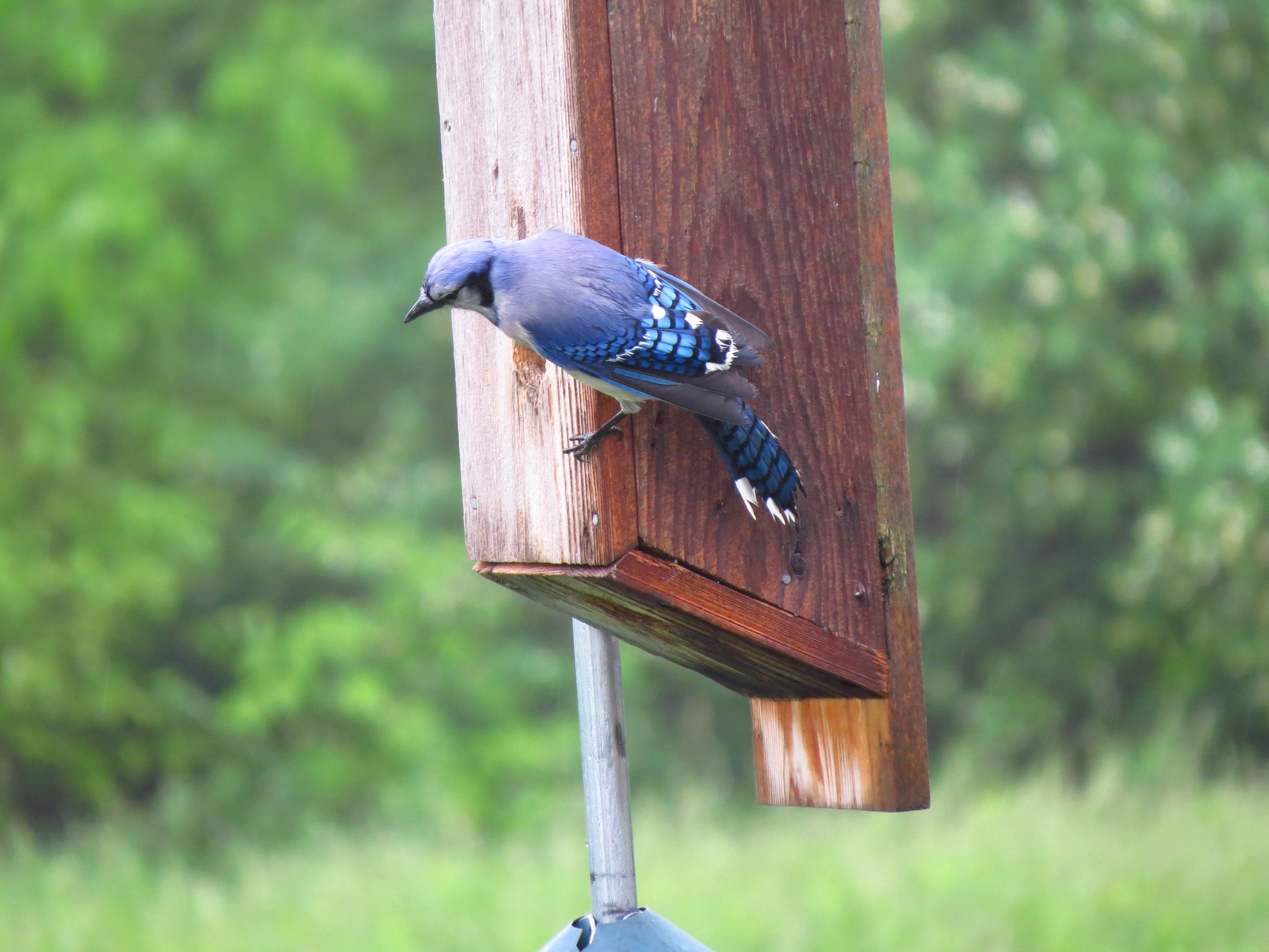 The blue jays learned to fly to a shrub about twelve feet away and use it as an airstrip. They take off and fly to the hole and quickly grab a peanut before they lose altitude. The Grackles stab into the hole and poke at the peanuts. They quickly drop to the ground and grab the peanuts before other birds can eat it. The sparrows, oh, those sparrows. Never mind, let’s not think about sparrows.