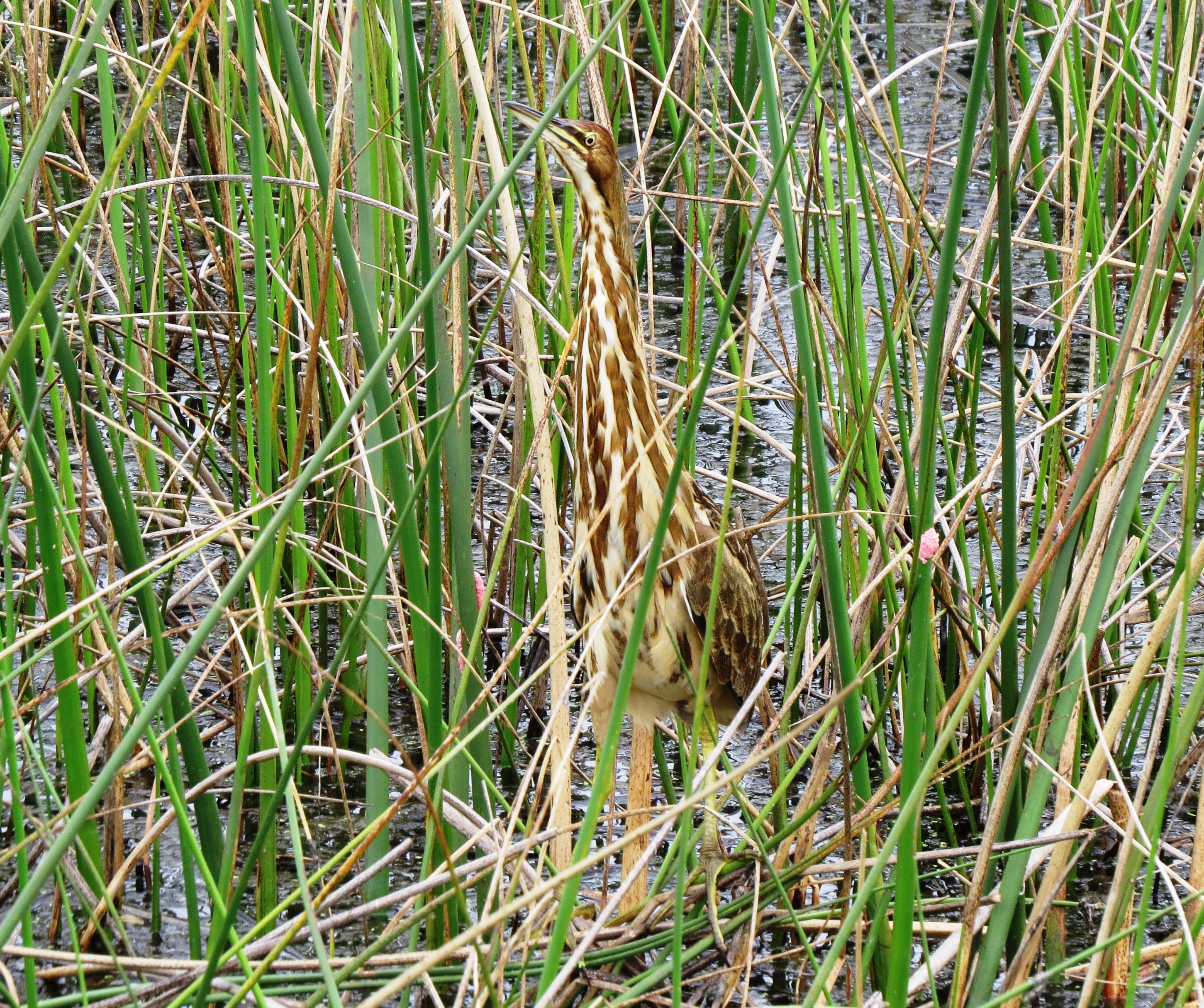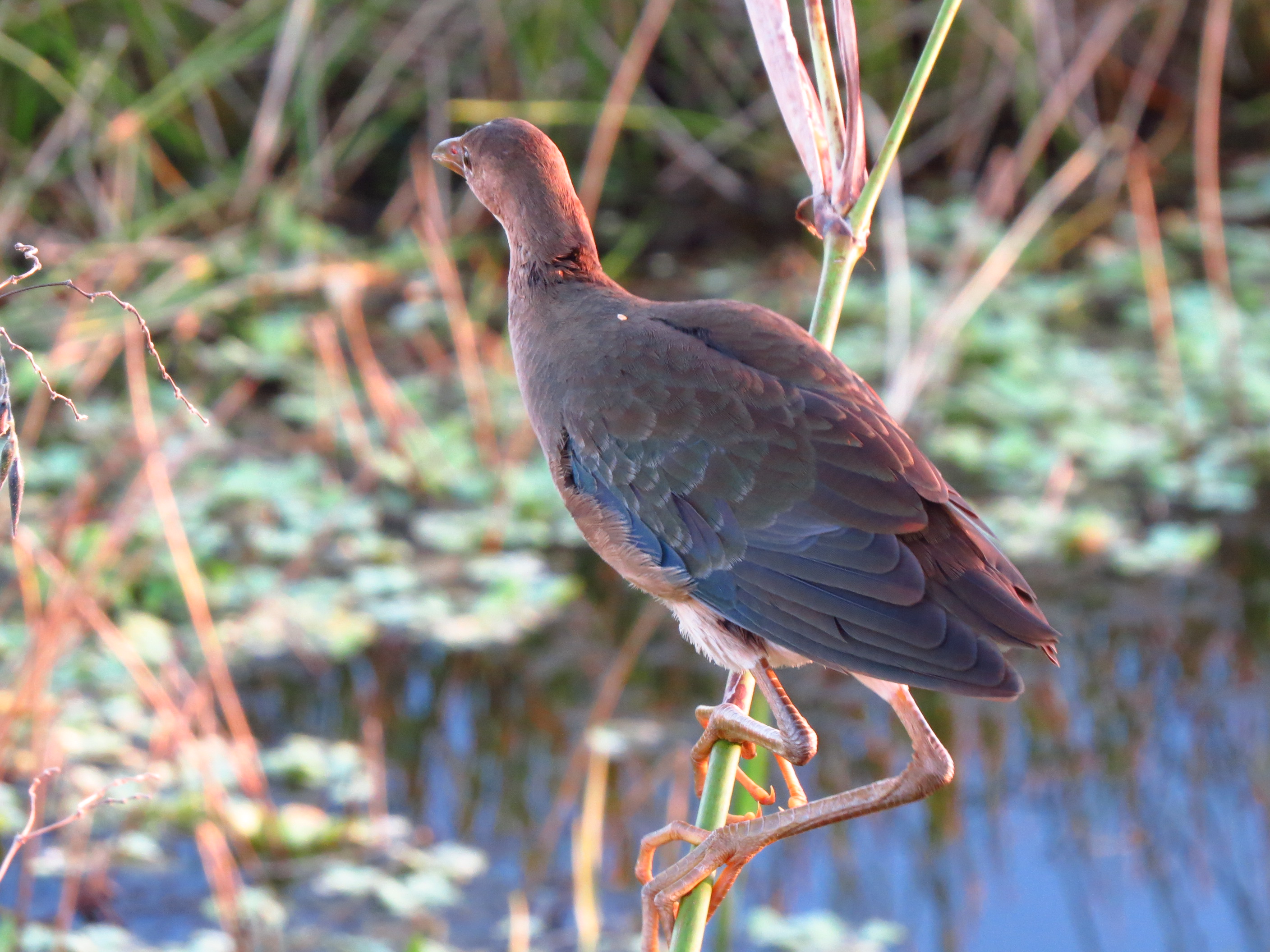 This is a juvenile Purple Gallinule. He is just starting to show his true colors. I watched this one for a long time and was amazed how these birds can seemingly walk on water. See its large feet. The most fragile vegetation will easily hold them.