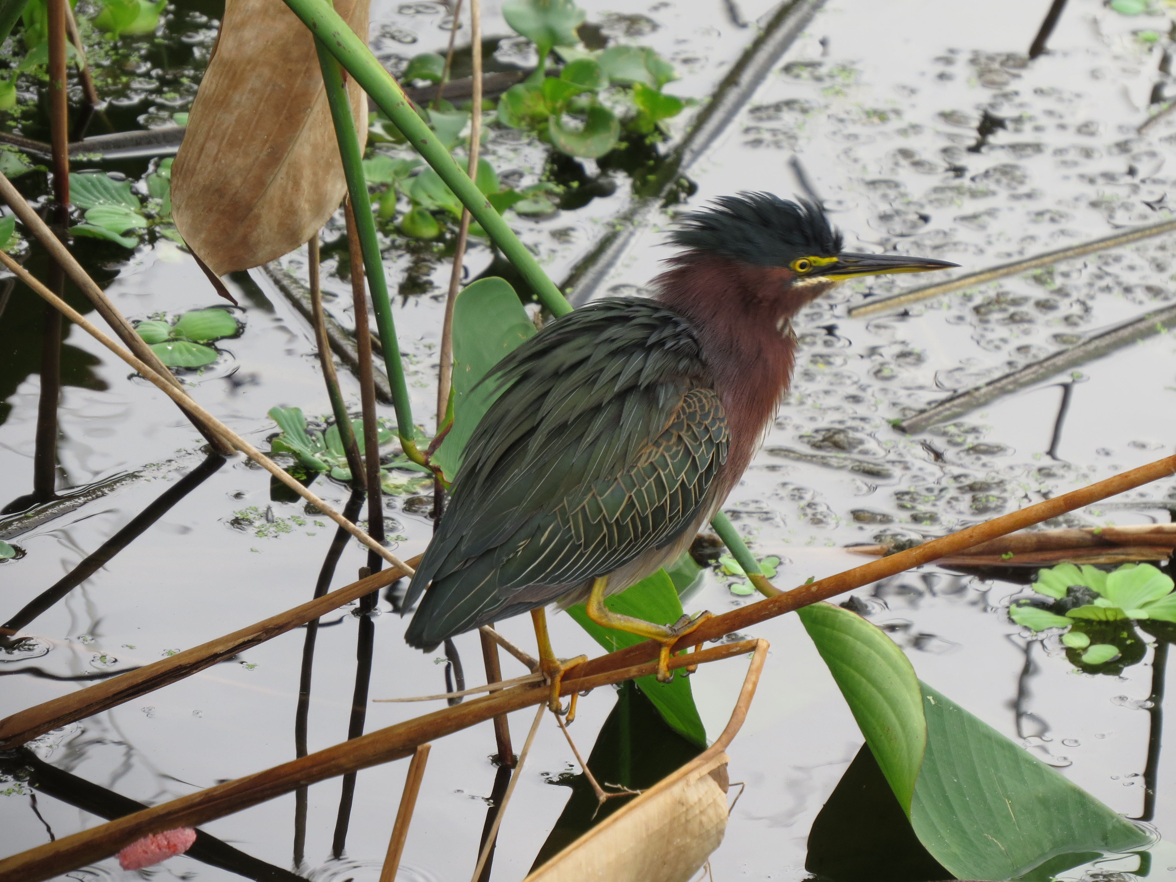 The Green Heron is a small bird and very beautiful. It is truly striking with their velvet-green back, rich chestnut body, and dark cap. They generally perch on a plant and wait patiently for lunch to show up in the form of small fish, eels, snails, or frogs. They strike with lightening speed, and lunch has been served.